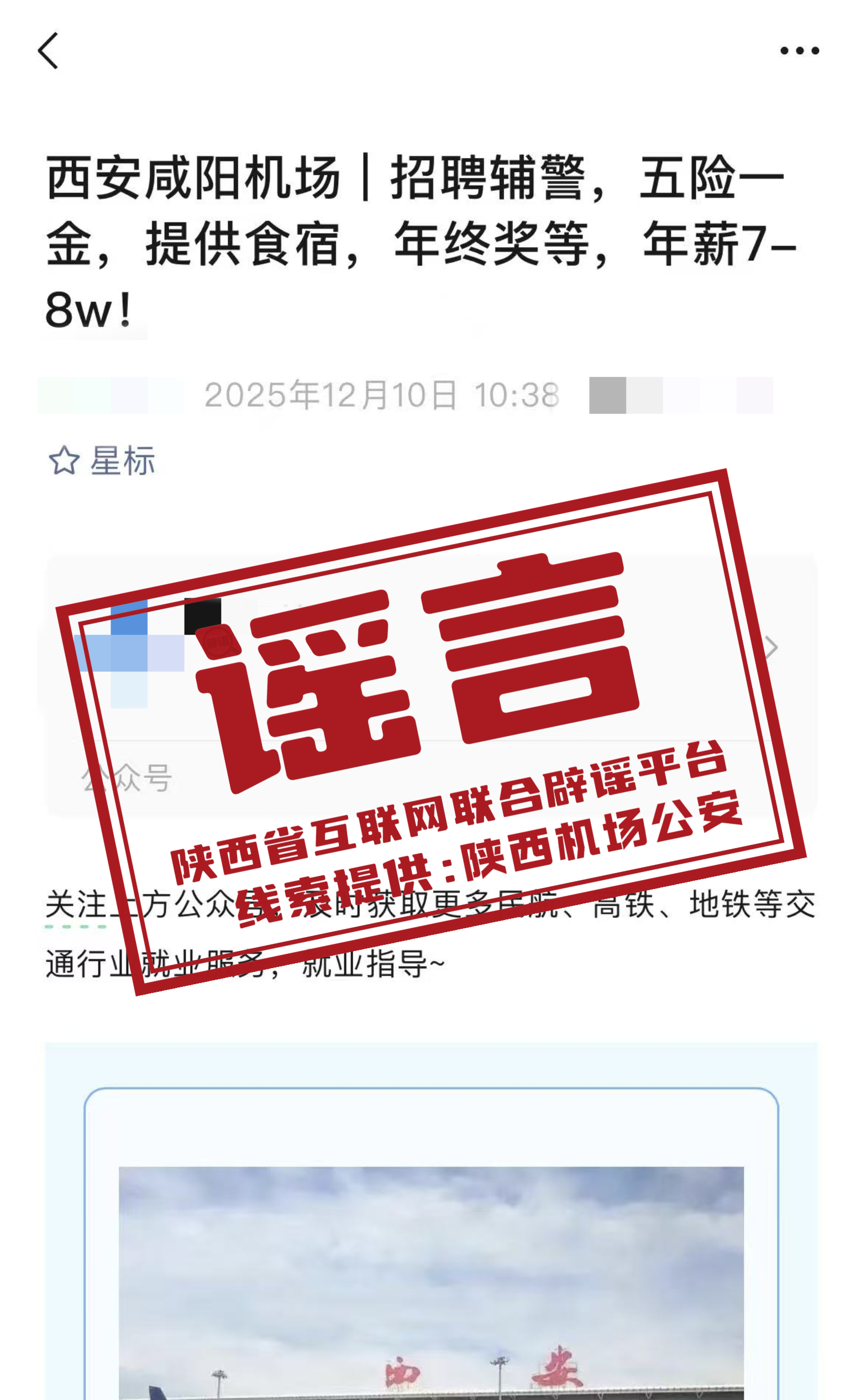对此,陕西机场公安郑重声明:近期并无招聘辅警计划,网传有关招聘信息均属谣言。