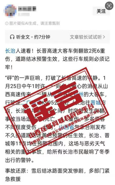 近日,网上出现“长治人速看!长晋高速大客车侧翻致2死6重伤,道路结冰预警生效,这些行车规则必须记牢!”等相关图文信息,引发广泛关注。经山西省公安厅交通管理总队高速三支队调查核实,相关网传内容所指路段并未发生交通事故。网传内容关于“事故当场造成2人死亡、6人重伤,多名乘客不同程度受伤”等言论皆为不实信息。