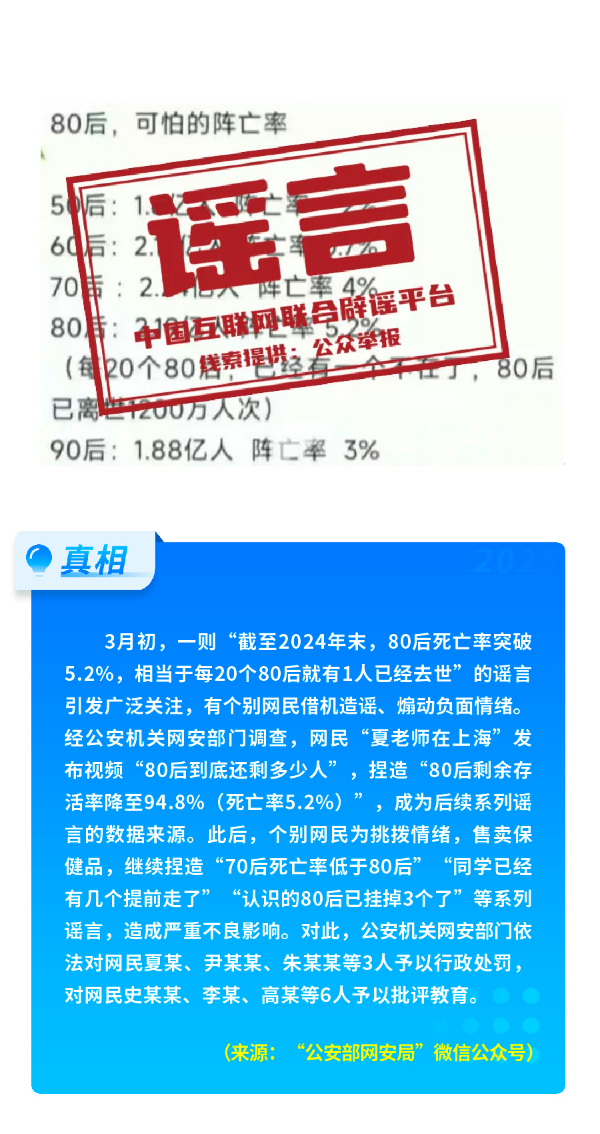 双管齐下共筑清朗空间。各级网信和公安等部门协同联动,通过“权威辟谣+依法惩处”双管齐下,曝光典型案例,依法严惩造谣传谣者,形成有力警示震慑效应。前述“90后省级机关干部相亲,年收入35-40万元”和“有顶流明星在澳门输了10亿”的造谣者,分别被警方依法行政拘留;造谣“广东多地出现冰雹天气”和“80后死亡率突破5.2%”的网民也被予以行政处罚和批评教育。此外,为保护公民合法权益,维护社会公共利益,国家互联网信息办公室、工业和信息化部、公安部、国家广播电视总局联合发布《人工智能生成合成内容标识办法》,建立AI生成内容强制标识制度,为网络谣言治理提供重要制度保障。