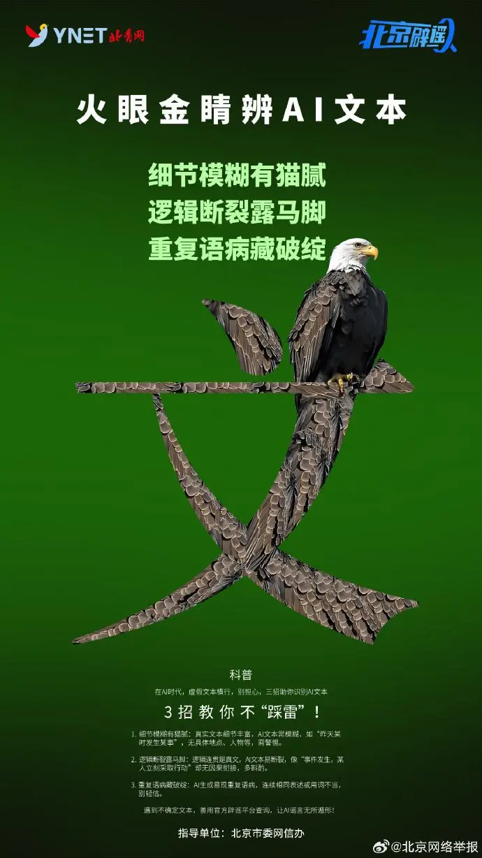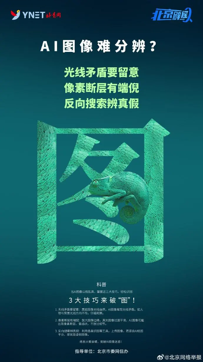 数字化的今天,AI技术正在逐渐改变我们的生活方式和工作方式。它让生活更加舒适、工作更加高效。然而,一些别有用心之人借助AI工具,生产发布仿真度高的虚假信息,迷惑大家的视线。如何有效辨别AI生成的图片、文字、声音?请掌握这些技巧,练就“火眼金睛”,不被AI谣言迷惑!
