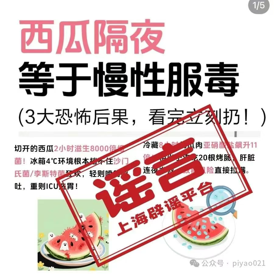 此外,要注意部分博主断章取义,传播“隔夜西瓜吃了会休克”消息。近期,有消费者因食用西瓜不当后出现肠胃不适,擅自过量服用药物,出现了肾损伤等严重后果。有博主却只说西瓜有问题,不提错误服药,同样是误导。消费者若吃了不洁西瓜后出现身体不适,应尽快就医,对症下药。