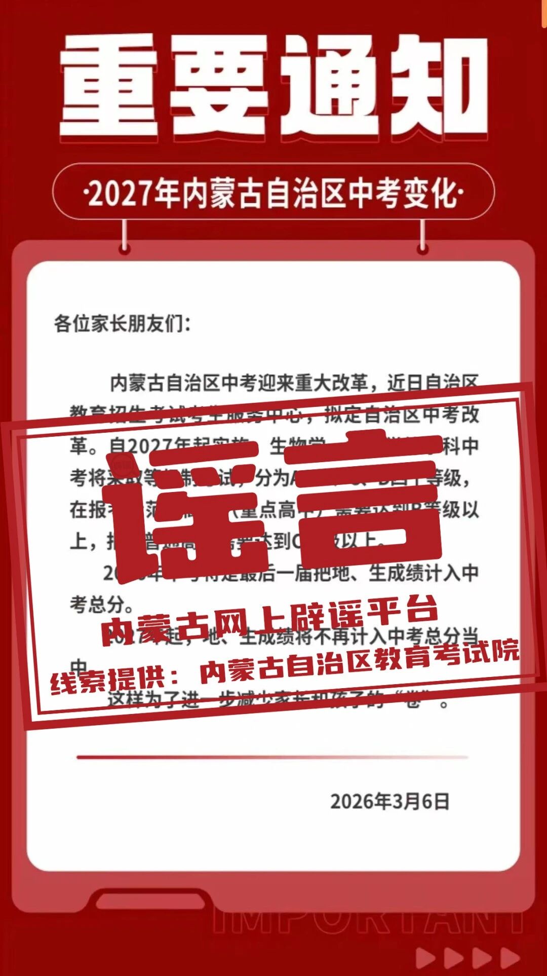 近日,社交平台流传一则关于“内蒙古自治区中考改革”的不实信息,称“自2027年起,生物学、地理学科目将采取等级制考试”等。