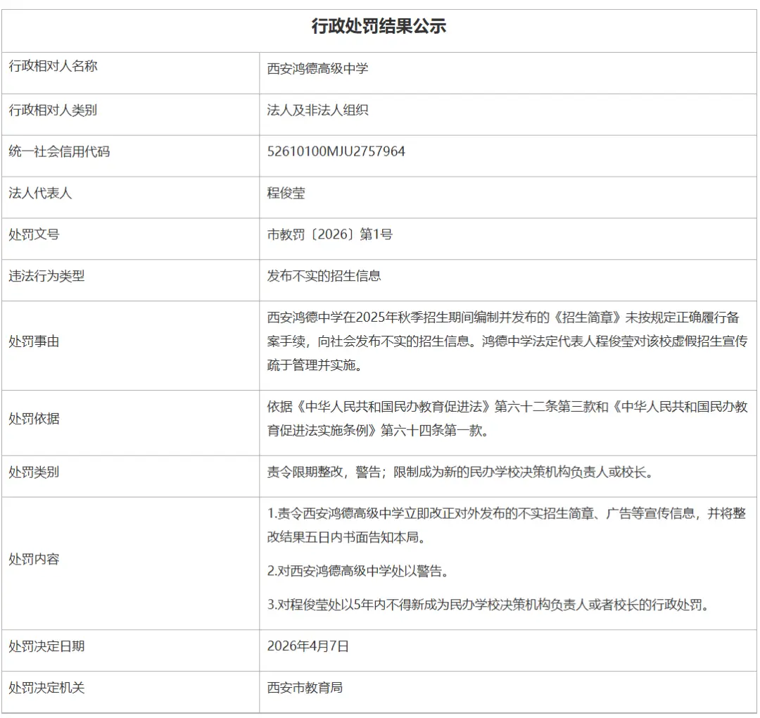 鸿德中学在2025年秋季招生期间,编制并发布的《招生简章》未按规定正确履行备案手续,向社会发布不实的招生信息。法定代表人程俊莹对该校虚假招生宣传疏于管理并实施。