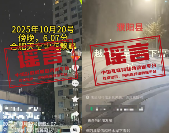 真相:近期,多地迎来降温,网络上陆续出现“2025年10月20日傍晚合肥天空雪花飘飘”“安徽淮南下雪了”“河南濮阳下雪”等内容的视频,引发关注。经河南濮阳,安徽合肥、淮南等地气象部门核实,近期未监测到降雪情况,上述信息系谣言。(来源:河南省网络辟谣平台、@大皖新闻)