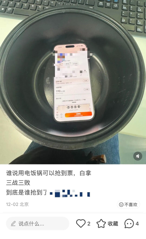 其次,与抢票相关的焦虑也会强化一种行为仪式化倾向。当用户面临高度竞争、几乎无法完全掌控结果的场景时,人们往往需要通过某种重复而可执行的动作来获得心理上的稳定感。把手机放进电饭锅、清后台、重启手机、把手机举高等,都是这一类操作。