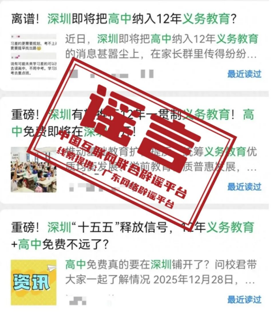 真相:近日,“深圳有望推行12年义务教育,高中免费将在深圳铺开”的消息在社交平台流传,相关话题引发议论。经深圳市教育局核实:以上网络言论均不具备可信度。义务教育年限为国家统一规定,深圳无权自行调整;若有相关政策变动,需以国家教育行政部门发布的正式文件为准,建议市民密切关注官方通知。(来源:“深圳网络辟谣”微信公众号、奥一新闻)