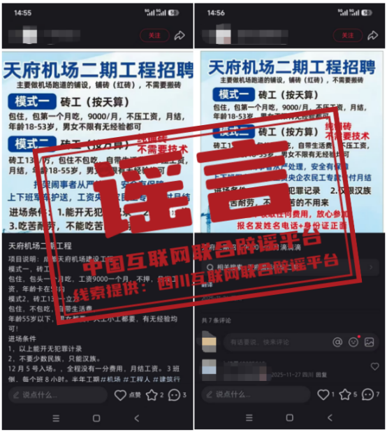 真相:近期,网传“成都天府机场二期工程正在招工”,引发关注。1月15日,成都东部新区公园城市建设局与成都天府国际机场二期扩建工程前期工作办公室联合发布《关于天府国际机场二期工程相关信息的公告》指出:以上招工信息均为虚假内容,请广大群众切勿轻信。(来源:四川互联网举报辟谣平台)