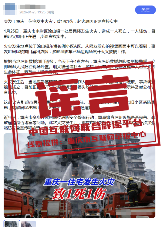 真相:1月25日,有网民在互联网发布信息称“重庆市南岸区涂山镇一处居民楼发生火灾,造成一人死亡,一人轻伤”,引发关注。经向南岸区消防部门核实,1月25日南岸区涂山镇未发生火情,网传信息不实。目前,警方正对造谣者展开调查。(来源:“重庆辟谣”微信公众号)