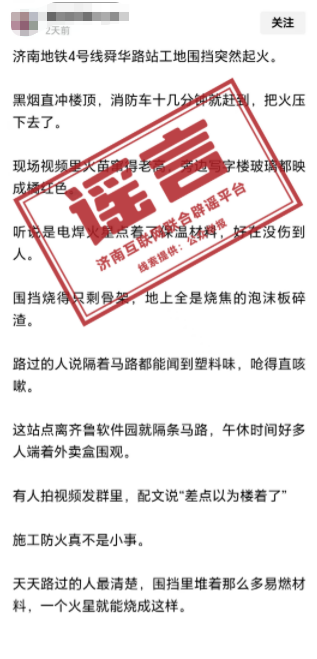 经核查,济南地铁4号线已建成通车,舜华路站工地围挡已拆除,且济南消防近期没有接到相关火情。在此提醒广大网民:文明上网、理性发言,不造谣、不信谣、不传谣。