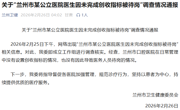 2026年2月25日下午,网络出现“兰州市某公立医院医生因未完成创收指标被待岗”相关信息。对此,我委即成立工作组进行调查核实。经查,兰州市口腔医院在日常管理中没有设置创收指标的情况,也没有因此导致医务人员待岗的情况。
