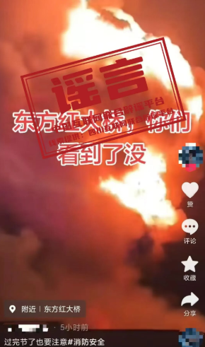 详情:近日,有网民发布视频称四川绵阳“东方红大桥发生火灾”,评论中提及火灾是当地举办烟花秀导致,引发关注。经当地消防部门核实,近期未接到该区域相关火情报警;属地街道及相关部门核实,该区域未举办任何烟花秀活动,实地核查亦未发现任何火情痕迹,网传消息纯属谣言。(来源:“四川举报辟谣”微信公众号、网信游仙)