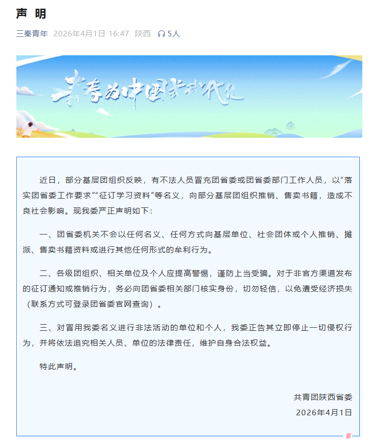 近日,部分基层团组织反映,有不法人员冒充团省委或团省委部门工作人员,以“落实团省委工作要求”“征订学习资料”等名义,向部分基层团组织推销、售卖书籍,造成不良社会影响。现我委严正声明如下: