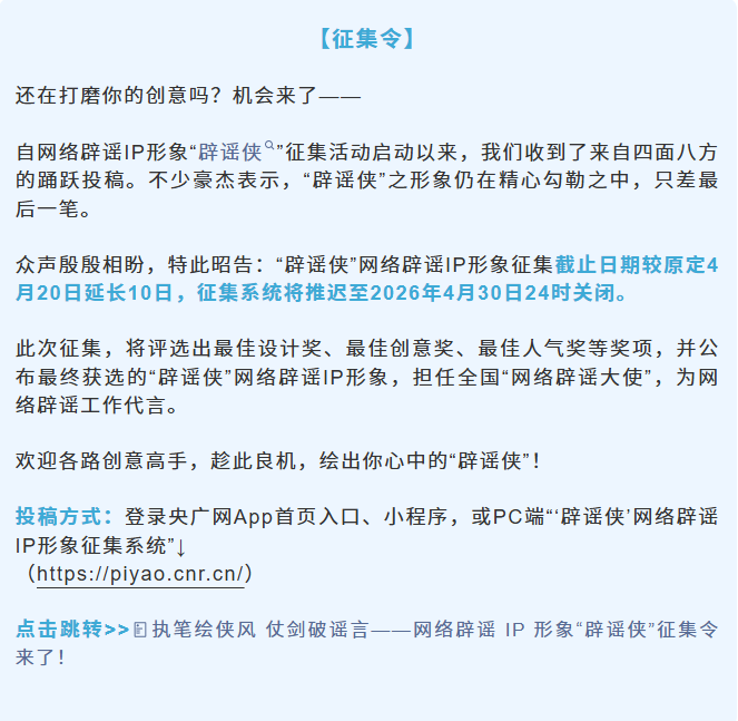 别错过!网络辟谣IP形象“辟谣侠”征集截稿延长10天,各路创意高手请出手